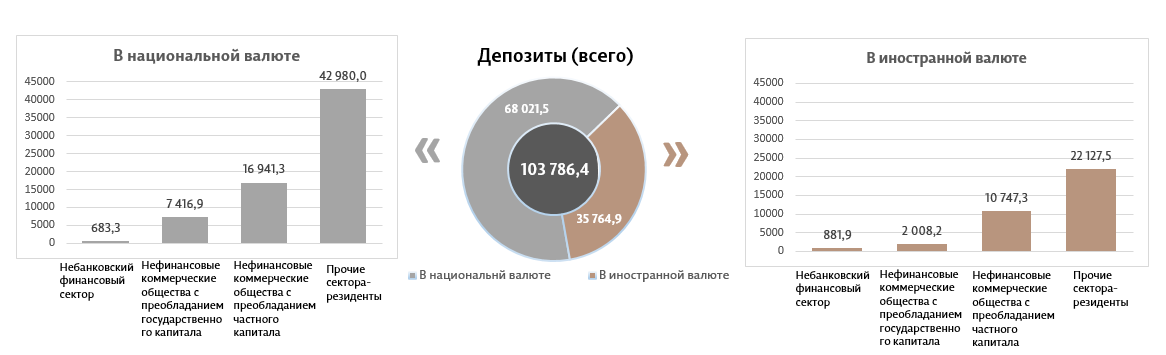 Сальдо депозитов в национальной валюте увеличилось на 440,7 миллиона леев по сравнению с предыдущим месяцем и составило 68 021,5 миллиона леев, составив долю 65,5% от общего сальдо депозитов. В то же время сальдо депозитов в иностранной валюте (пересчитанное в леях) увеличилось на 2 081,5 миллиона леев по сравнению с предыдущим месяцем, до уровня 35 764,9 миллиона леев, с долей 34,5% (диаграмма 3).