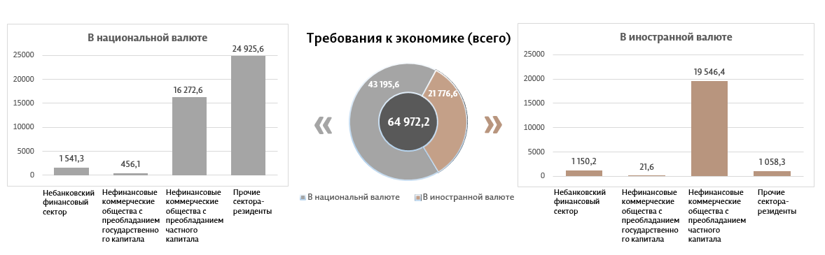 10. Требования к национальной экономике представляют собой требования банковской системы Республики Молдова (включая банки, находящиеся в процессе ликвидации), в национальной валюте и в иностранной валюте, к нефинансовым коммерческим компаниям с преобладающим государственным или частным капиталом, к другие секторам резидентам. В этот показатель входят: кредиты и займы (включая просроченную задолженность), непогашенные проценты по кредитам; долговые ценные бумаги и акции; другие требования.