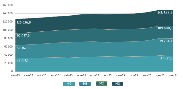 Денежная масса M36 снизилась на 336,3 миллиона леев (-0,2%) по сравнению с декабрем 2023 г. и составила 148 844,4 миллиона леев, на 17,5% выше по сравнению с тем же периодом прошлого года.
