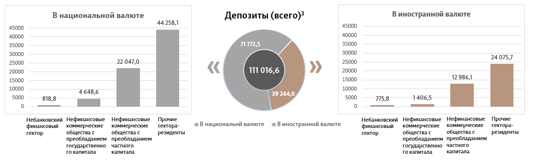 Сальдо депозитов в национальной валюте увеличилось на 294,3 миллиона леев по сравнению с предыдущим месяцем и составило 71 772,5 миллиона леев, составив долю 64,7% от общего сальдо депозитов. В то же время сальдо депозитов в иностранной валюте (пересчитанное в леях) увеличилось на 95,6 миллиона леев по сравнению с предыдущим месяцем, до уровня 39 244,0 миллиона леев, с долей 35,3% (диаграмма 3).