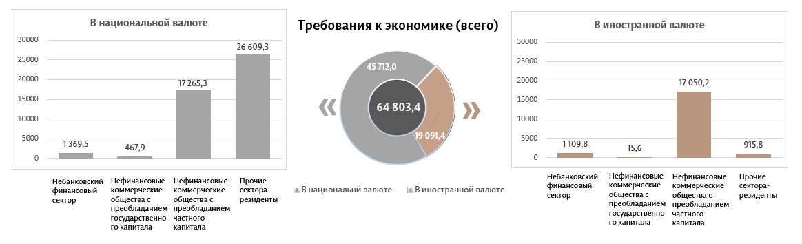 10. Требования к национальной экономике представляют собой требования банковской системы Республики Молдова (включая банки, находящиеся в процессе ликвидации), в национальной валюте и в иностранной валюте, к нефинансовым коммерческим компаниям с преобладающим государственным или частным капиталом, к другие секторам резидентам. В этот показатель входят: кредиты и займы (включая просроченную задолженность), непогашенные проценты по кредитам; долговые ценные бумаги и акции; другие требования.