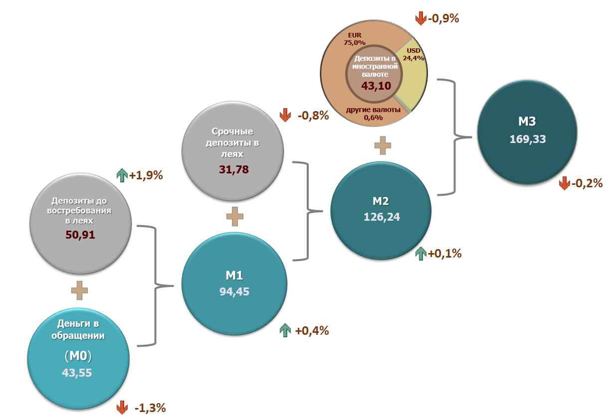 4. Денежная масса М1 включает деньги в обращении (М0) и депозиты до востребования резидентов в молдавских леях.