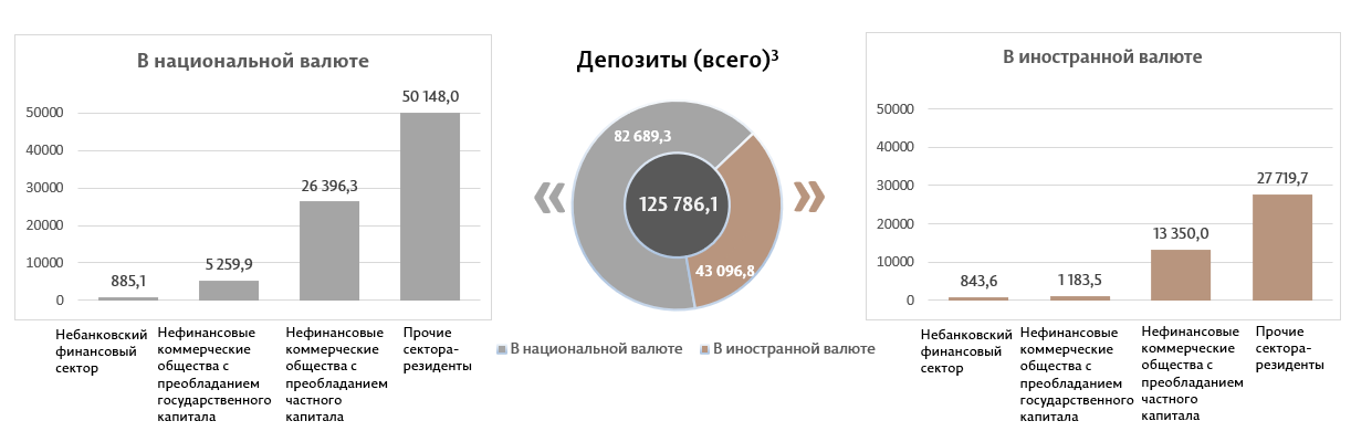 Сальдо депозитов в национальной валюте увеличилось на 681,2 миллиона леев по сравнению с предыдущим месяцем, составив 82 689,3 миллиона леев, или 65,7% от общего сальдо депозитов. В то же время сальдо депозитов в иностранной валюте (пересчитанное в леях) уменьшилось на 388,9 миллиона леев по сравнению с предыдущим месяцем, до уровня 43 096,8 миллиона леев, с долей 34,3% (диаграмма 3).
