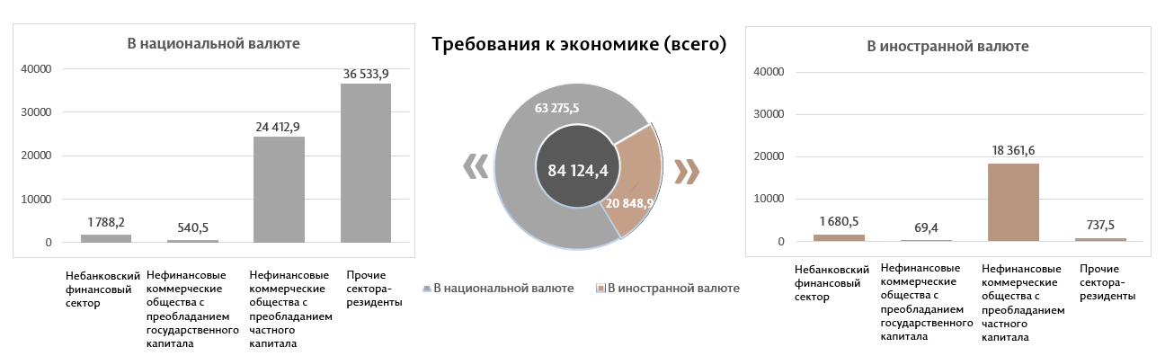 10. Требования к национальной экономике представляют собой требования банковской системы Республики Молдова (включая банки, находящиеся в процессе ликвидации), в национальной валюте и в иностранной валюте, к нефинансовым коммерческим компаниям с преобладающим государственным или частным капиталом, к другим секторам-резидентам. В этот показатель входят: кредиты и займы (включая просроченную задолженность), непогашенные проценты по кредитам; долговые ценные бумаги и акции; другие требования.
