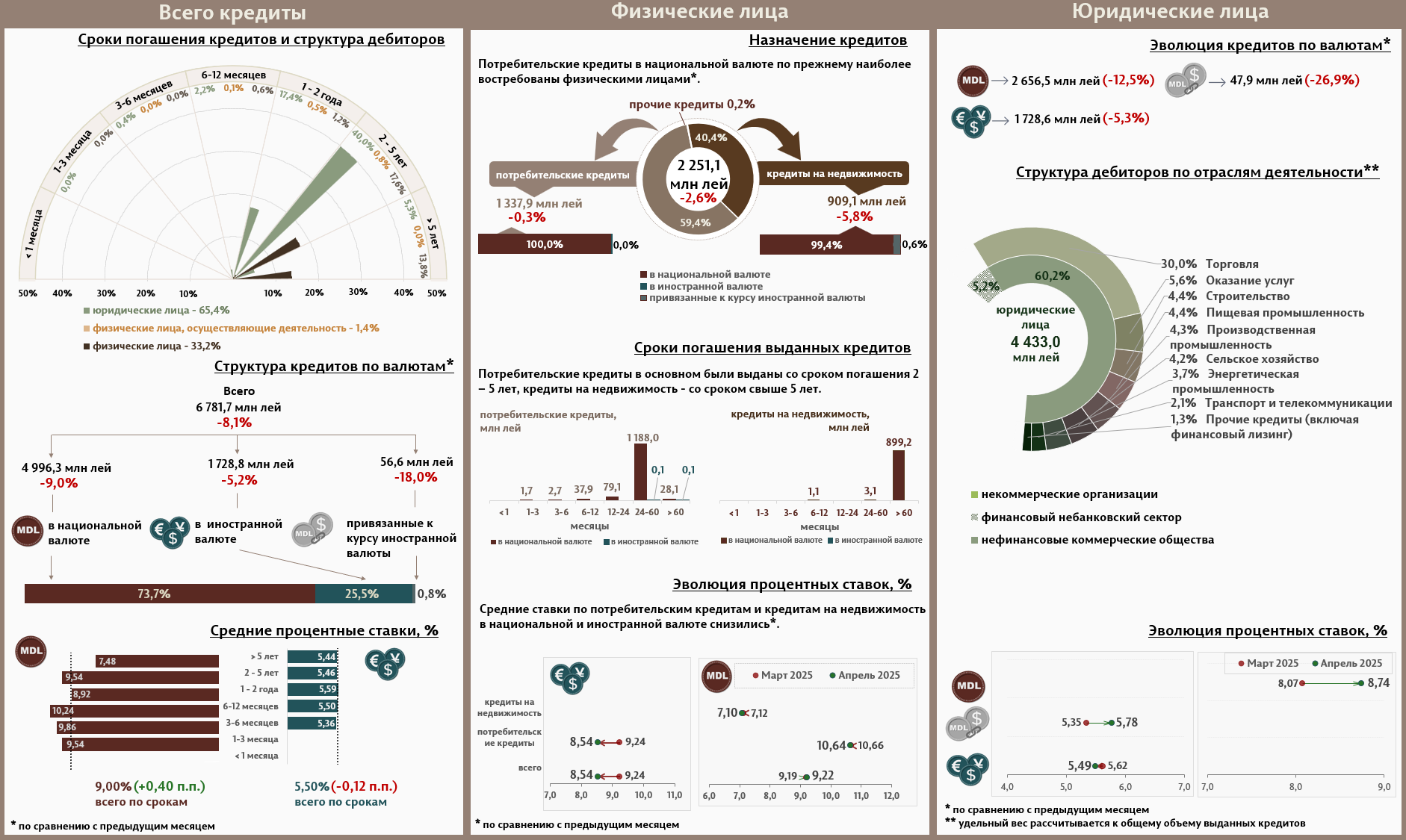 В апреле 2025 г. вновь выданные кредиты1 составили 6 781,7 миллиона леев, на 8,1% меньше, чем в марте 2025 г. (Инфографика 1). Основная часть (73,7%) пришлась на кредиты в национальной валюте, которые составили 4 996,3 миллиона леев, уменьшившись на 9,0% по сравнению с предыдущим месяцем.