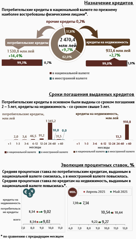 Физические лица в мае 2025 года получили кредиты в объёме 2 470,4 миллиона леев, что на 9,7% больше по сравнению с предыдущим месяцем. Значительную часть этих кредитов (62,0%) составили потребительские кредиты (Инфографика 2). При этом большинство из них (1 345,2 миллиона леев) было выдано в национальной валюте со сроком от 2 до 5 лет.