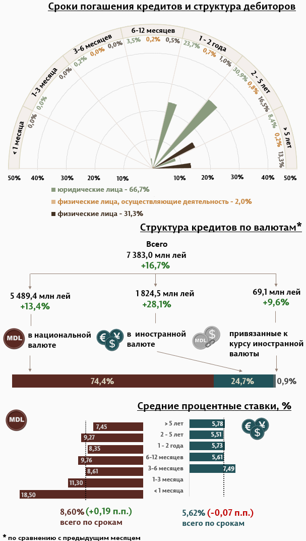 В марте 2025 г. вновь выданные кредиты составили 7 383,0 миллиона леев, на 16,7% больше, чем в феврале 2025 г. (Инфографика 1). Основная часть (74,4%) пришлась на кредиты в национальной валюте, которые составили 5 489,4 миллиона леев, увеличившись на 13,4% по сравнению с предыдущим месяцем.