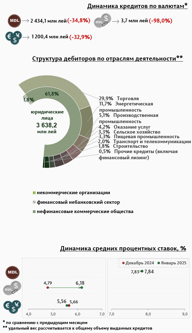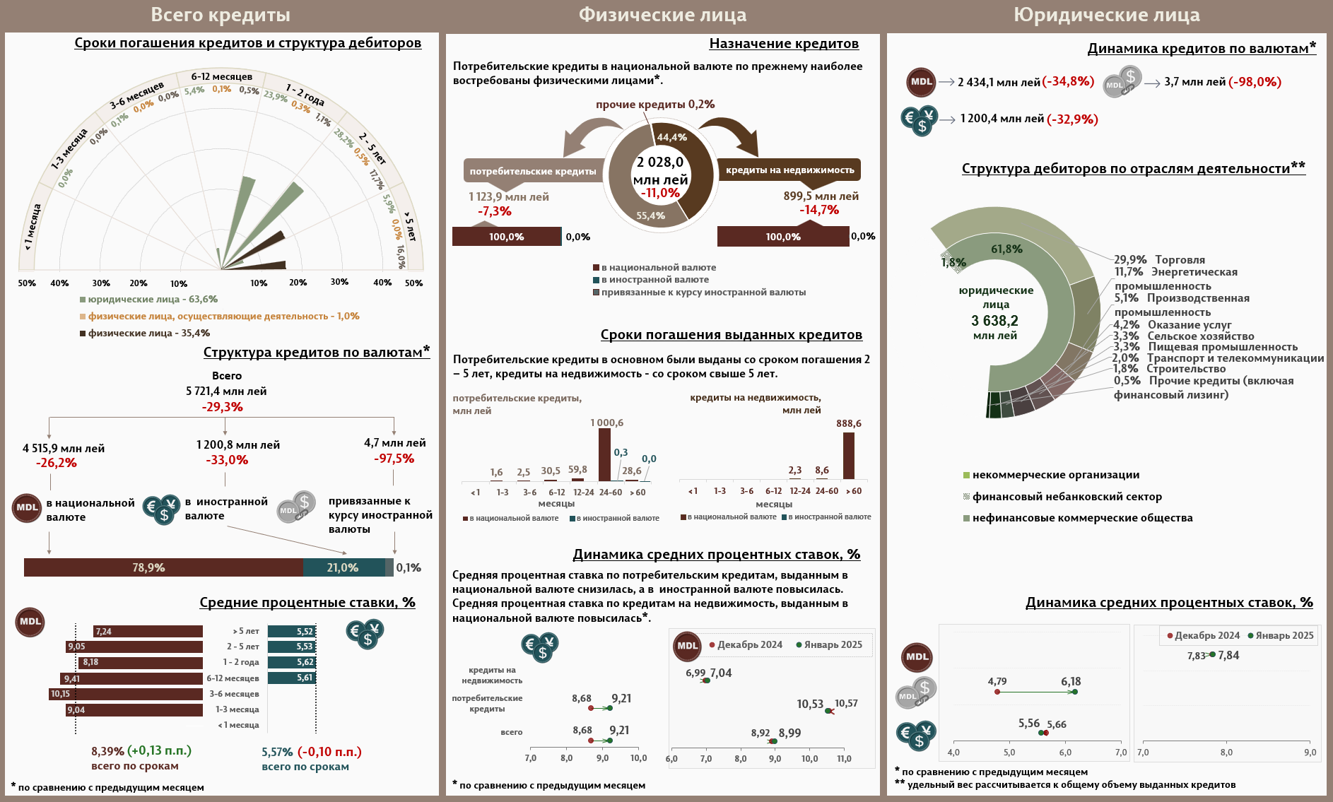 В январе 2025 г. вновь выданные кредиты1 составили 5 721,4 миллиона леев, на 29,3% меньше, чем в декабре 2024 г. (Инфографика 1). Основная часть (78,9%) пришлась на кредиты в национальной валюте, которые составили 4 515,9 миллиона леев, уменьшившись на 26,2% по сравнению с предыдущим месяцем.