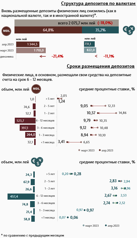 Депозиты физических лиц в апреле 2023 года составили 2 075,7 миллиона леев, на 18,0% ниже по сравнению с предыдущим месяцем (Инфографика 2).