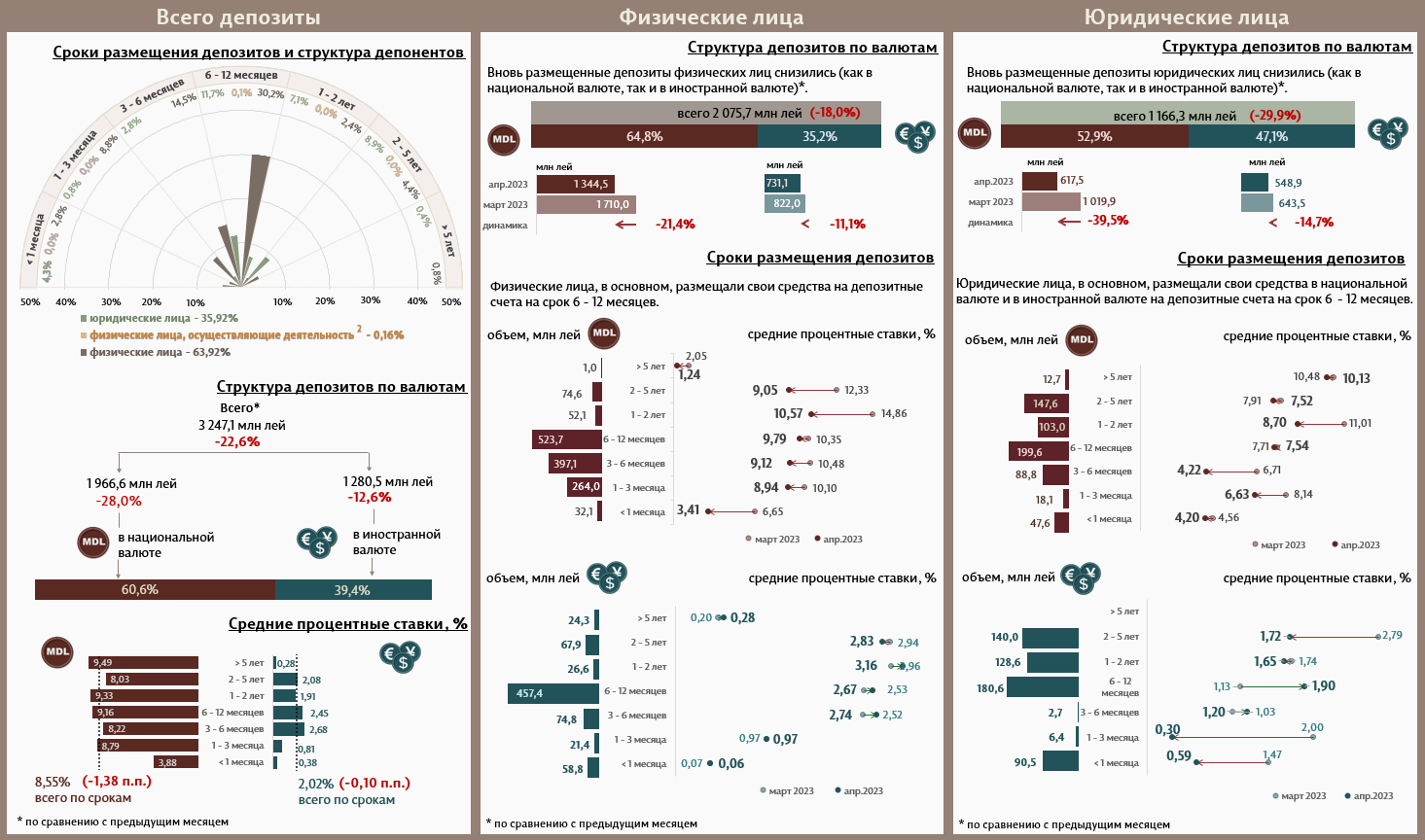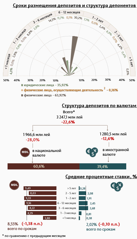 В апреле 2023 вновь привлеченные срочные депозиты1 (Инфографика 1) составили 3 247,1 миллиона леев, на 22,6% ниже марта 2023 года. Привлеченные депозиты в национальной валюте зарегистрировали значительную долю в 60,6% и составили 1 966,6 миллиона леев, на 28,0% ниже по сравнению с предыдущим месяцем.
