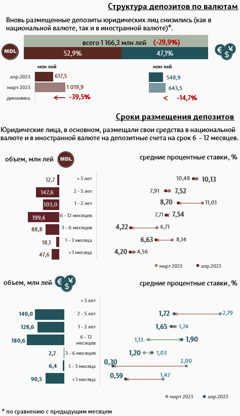 В апреле 2023 г., по сравнению с предыдущим месяцем, депозиты физических лиц (Инфографика 3) в национальной валюте снизились на 39,5%, а депозиты в иностранной валюте - на 14,7%, соответственно. Депозиты юридических лиц в национальной валюте составили 617,5 миллиона леев, а в валюте – 548,9 миллиона леев.