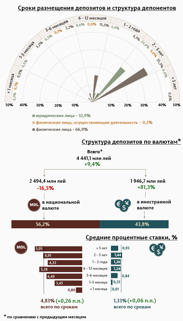 В апреле 2025 г. вновь привлечённые срочные депозиты1 (Инфографика 1) составили 4 441,1 миллиона леев, увеличившись на 9,4% по сравнению с мартом 2025 года. Привлечённые депозиты в национальной валюте составили наибольшую долю в 56,2% или 2 494,4 миллиона леев, что на 16,5% меньше по сравнению с предыдущим месяцем. Депозиты, привлечённые в иностранной валюте, составили 1 946,7 миллиона леев, увеличившись на 81,3% по сравнению с предыдущим месяцем.