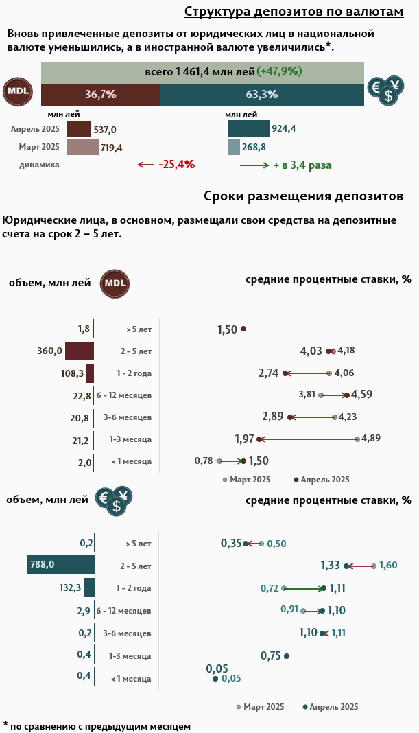 В апреле 2025 г., по сравнению с предыдущим месяцем, объём депозитов юридических лиц в национальной валюте сократился на 25,4%, а в иностранной валюте увеличился в 3,4 раза (Инфографика 3). Депозиты юридических лиц в национальной валюте составили 537,0 миллиона леев, а в иностранной валюте – 924,4 миллиона леев. По сравнению с апрелем 2024 г., объём депозитов юридических лиц в национальной валюте увеличился на 2,4%, а в иностранной валюте увеличился в 3,5 раза.