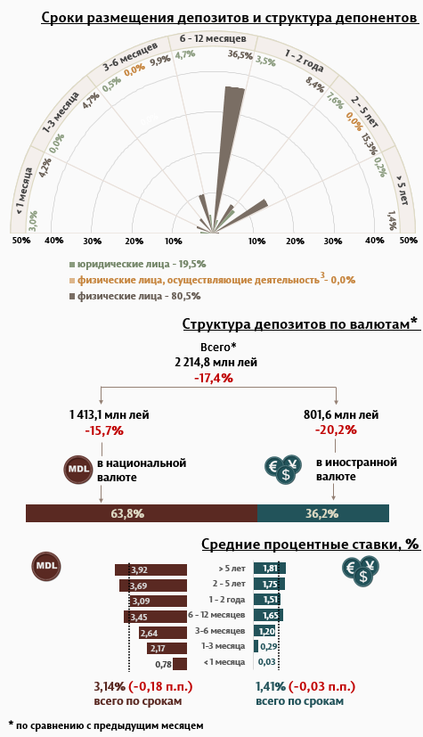 В отчетном месяце депозиты физических лиц составили 1 781,8 миллиона леев, уменьшившись на 14,3% по сравнению с предыдущим месяцем (Инфографика 2). Наиболее востребованными были депозиты со сроком от 6 до 12 месяцев, доля которых составила 45,4% от общего объема депозитов физических лиц.