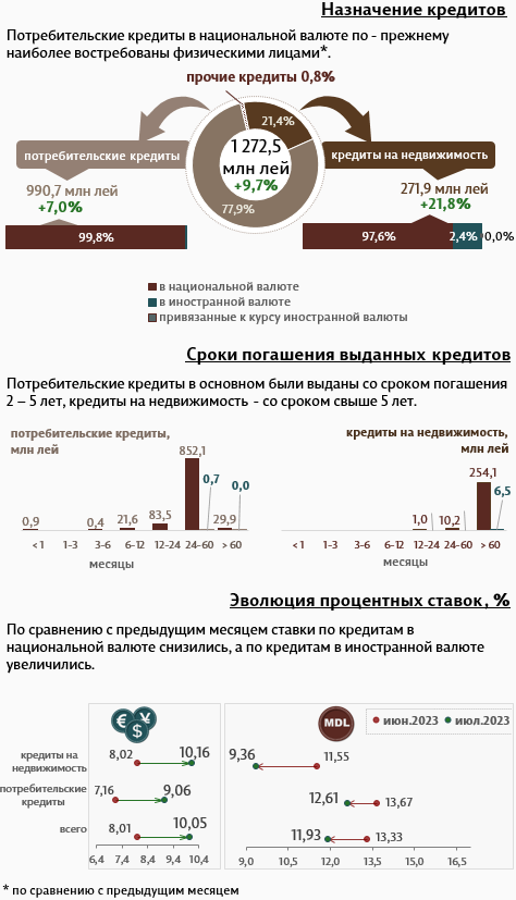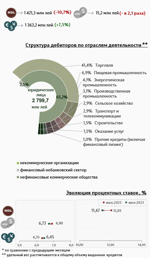 В июле 2023 г. вновь выданные кредиты1 (Инфографика 1) составили 4 130,4 миллиона леев, на 0,3% выше июня 2023 г. Основную часть (66,2%) составляют кредиты в национальной валюте, которые составили 2 733,9 миллиона леев, на 1,3% ниже по сравнению с предыдущим месяцем).
