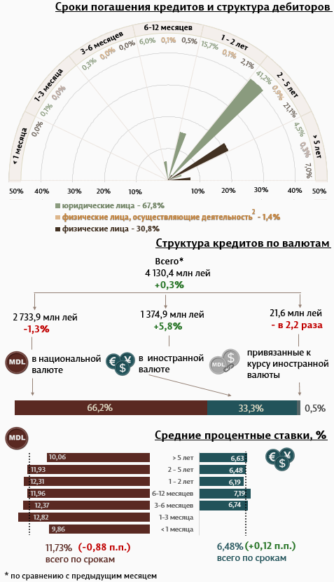 По сравнению с предыдущим месяцем, в отчетном периоде юридические лица затребовали меньше кредитов в национальной валюте (-10,7%). Объем кредитов в иностранной валюте увеличился на 7,5%, а привязанных к курсу валюты4 снизился в 2,1 раза.