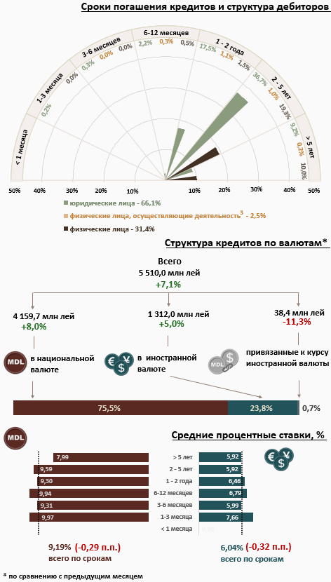 В апреле 2024 г. вновь выданные кредиты1 составили 5 510,0 миллиона леев, на 7,1% выше, чем в марте 2024 г. (Инфографика 1). Основная часть (75,5%) пришлась на кредиты в национальной валюте, которые составили 4 159,7 миллиона леев, увеличившись на 8,0% по сравнению с предыдущим месяцем.