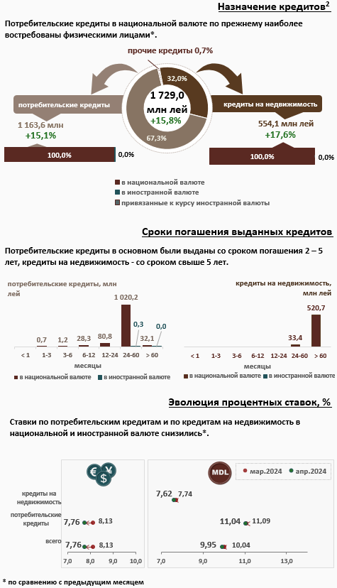 Физические лица в апреле 2024 года получили кредиты в объеме 1 729,0 миллиона леев, на 15,8% больше по сравнению с предыдущим месяцем, при этом, значительная часть из них (67,3%) составляли потребительские кредиты (Инфографика 2). Большая часть этих кредитов (1 020,2 миллиона леев) была выдана в национальной валюте со сроком от 2 до 5 лет.