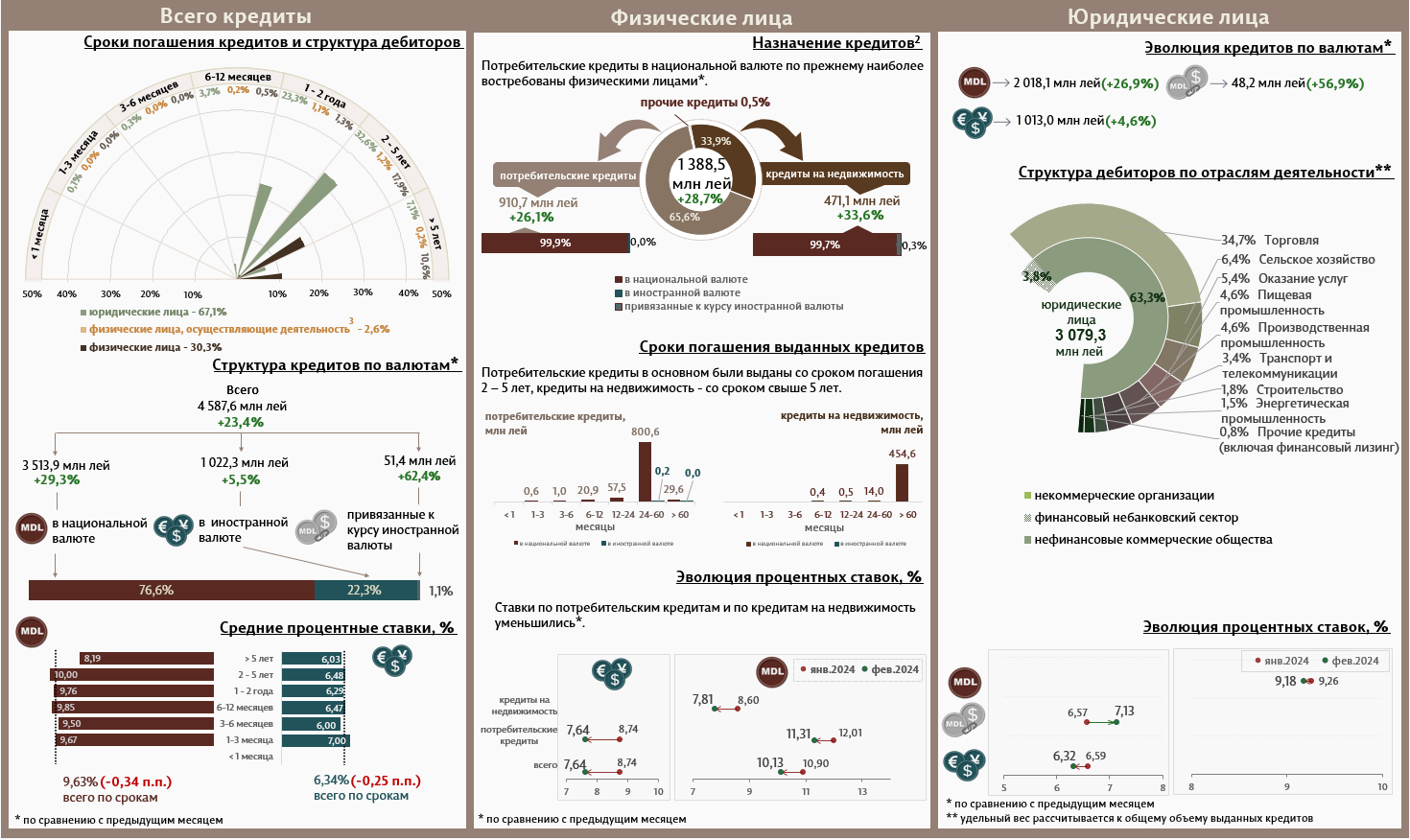 В феврале 2024 г. вновь выданные кредиты1 составили 4 587,6 миллиона леев, на 23,4% выше января 2024 г. (Инфографика 1). Основная часть (76,6%) пришлась на кредиты в национальной валюте, которые составили 3 513,9 миллиона леев, на 29,3% выше по сравнению с предыдущим месяцем.