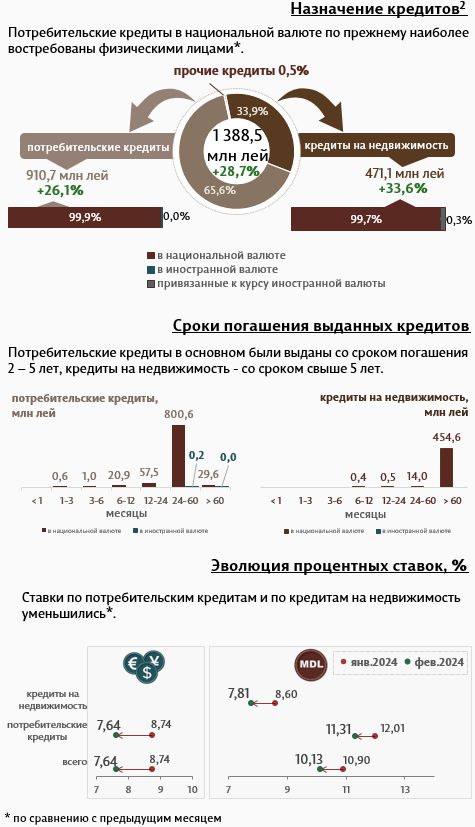Физические лица в феврале 2024 года получили кредиты в объеме 1 388,5 миллиона леев, на 28,7% больше по сравнению с предыдущим месяцем, большая часть (65,6%) была предоставлена на потребление (Инфографика 2). Наибольшая часть этих кредитов (800,6 миллиона леев) были выданы в национальной валюте сроком от 2 до 5 лет.