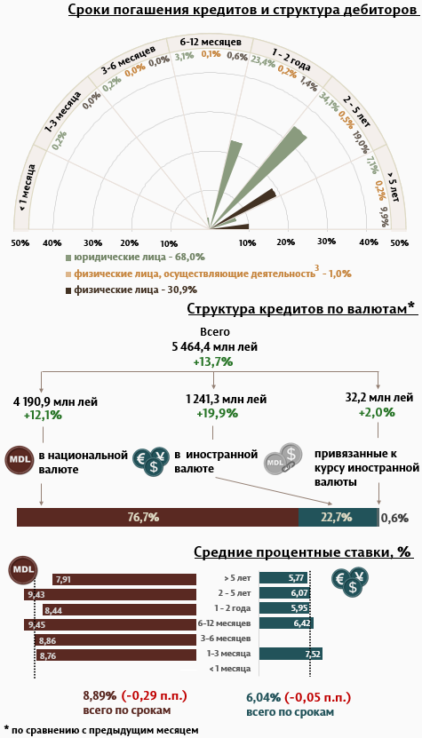 По сравнению с предыдущим месяцем (Инфографика 3), в отчетном периоде юридические лица востребовали больше кредитов в национальной валюте (+17,3%). Объем кредитов в иностранной валюте увеличился на 21,1%, а объем кредитов привязанных к курсу валюты3 увеличился на 8,9%.