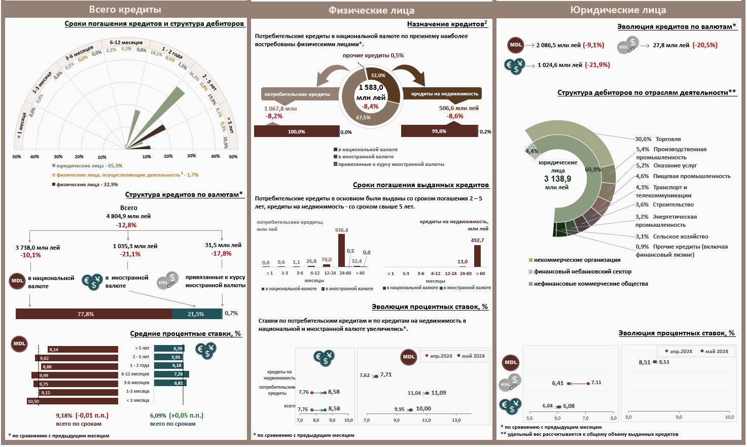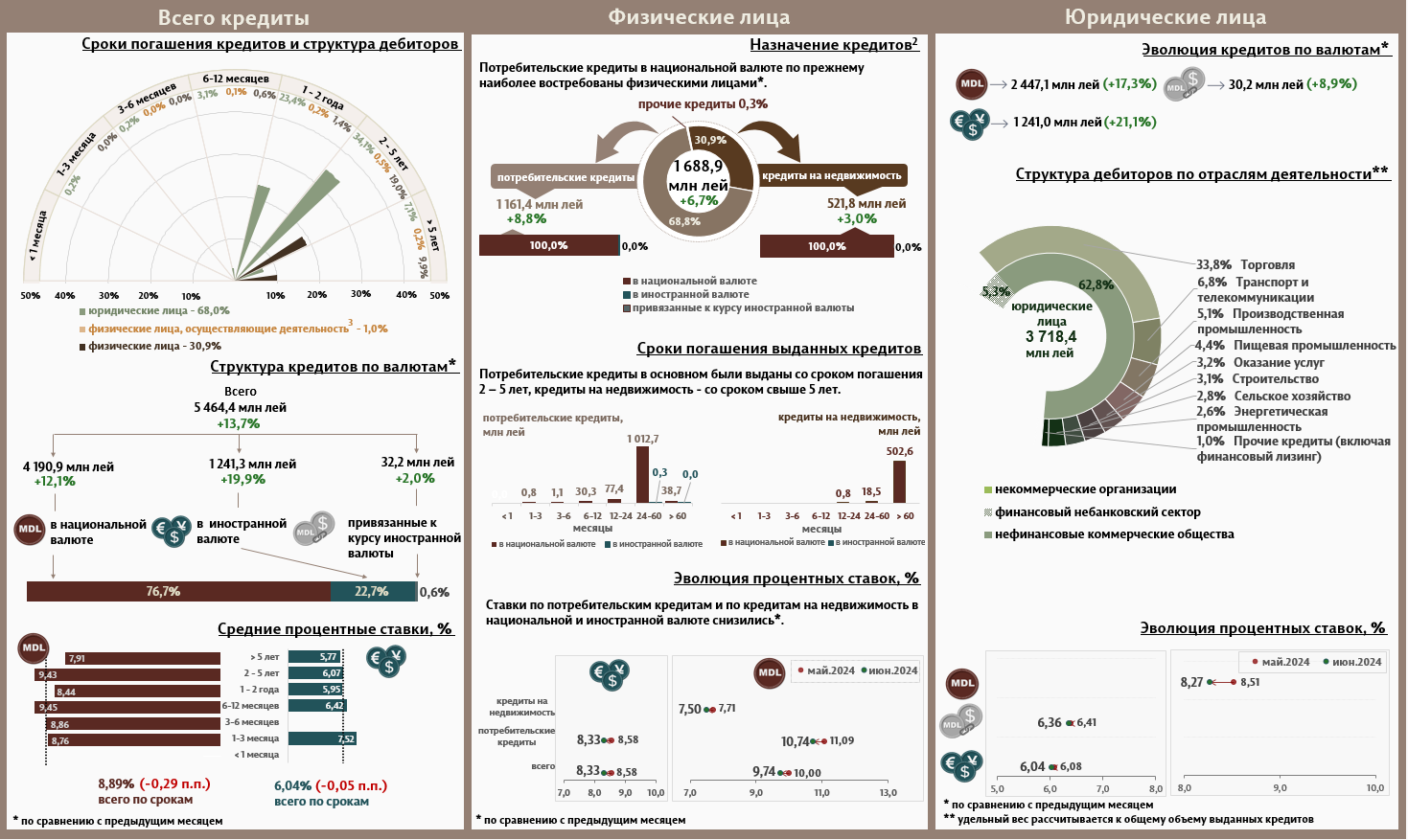 В июне 2024 г. вновь выданные кредиты1 составили 5 464,4 миллиона леев, на 13,7% выше, чем в мае 2024 г. (Инфографика 1). Основная часть (76,7%) пришлась на кредиты в национальной валюте, которые составили 4 190,9 миллиона леев, увеличившись на 12,1% по сравнению с предыдущим месяцем.