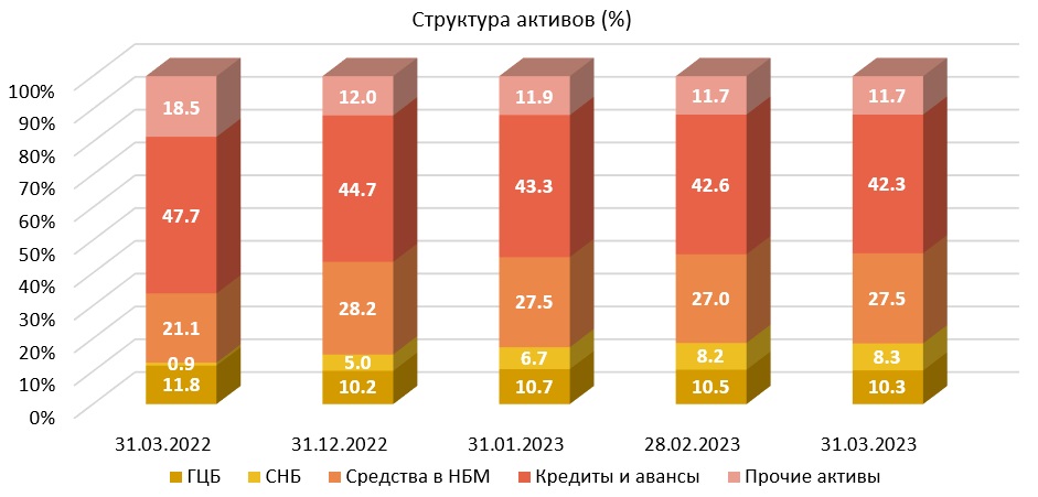 Банковский сектор по состоянию на 31.03.2023, на основании предоставленных отчетов лицензированными банками, зарегистрировал следующие тенденции: