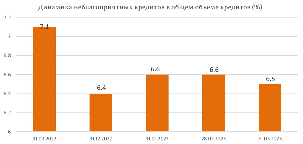 В течение отчетного периода доля неблагоприятных кредитов (субстандарт, сомнительные и скомпрометированные) в общих кредитах увеличилась незначительно - на 0,1 п. п., составив 6,5% на 31.03.2023 г., указанный показатель варьирует от 0,2% до 8,8%, в зависимости от банка.