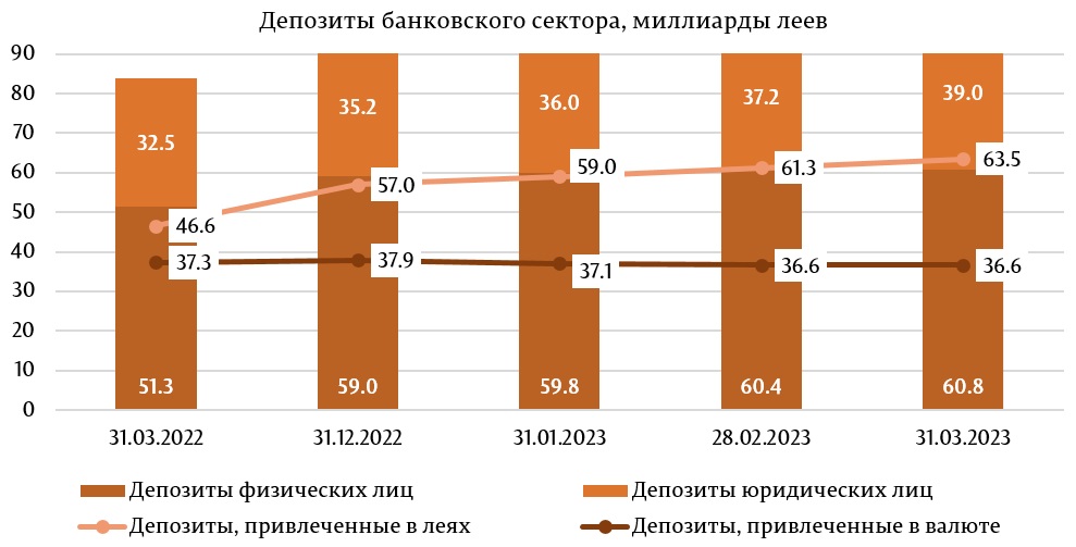 Из общего объема депозитов 63,4% составили депозиты в леях, сальдо депозитов увеличившись на 6,5 миллиарда леев (11,4%) по сравнению с концом прошлого года, составив 63,5 миллиарда леев на 31.03.2023. Депозиты в иностранной валюте составили 36,6% от общего количества депозитов, их сальдо в отчетном периоде снизилось на 1,3 миллиарда леев (3,4%), составив 36,6 миллиарда леев (снятие валютных депозитов – эквивалент 382,9 миллиона леев, общая переоценка валютных депозитов – (-901,2) миллиона леев).