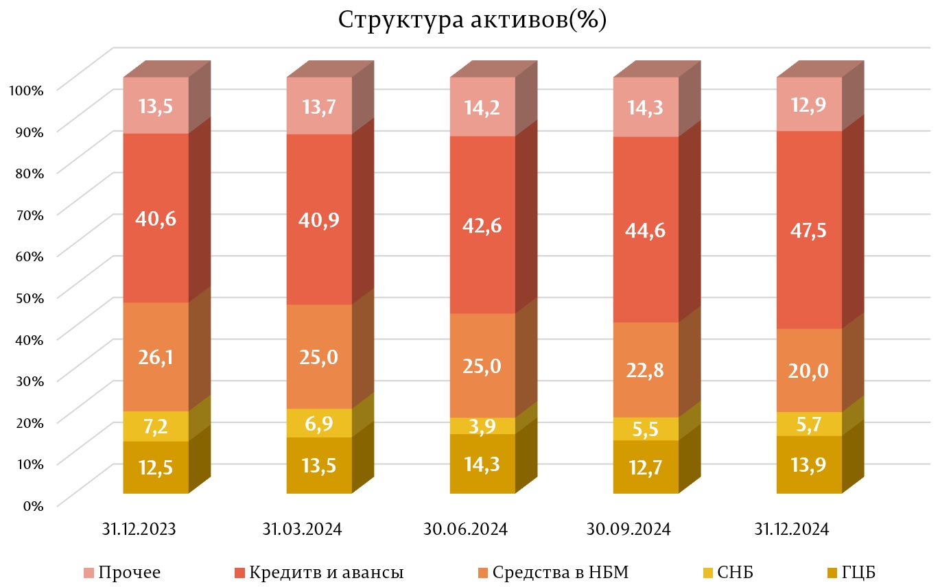 В структуре активов наибольшая доля пришлась на статью баланса «Кредиты и авансы по амортизированной стоимости», которая составила 47,5% (80 823,9 миллиона леев), увеличившись на 6,9 процентных пункта (п. п.) по сравнению с концом предыдущего года. Доля активов, размещенных в НБМ, составила 20,0% (33 991,8 миллиона леев), снизившись на 6,1 п. п., а доля банковских инвестиций в государственные ценные бумаги и сертификаты НБМ составила 19,6% (33 352,4 миллиона леев), снизившись на 0,2 п. п. Остальная часть активов, составляющая 12,9% (22 006,9 миллиона леев), поддерживается банками в других банках в денежной наличности, материальных и нематериальных активах и т.д. Их доля снизилась на 0,6 п. п. по сравнению с концом 2023 года.