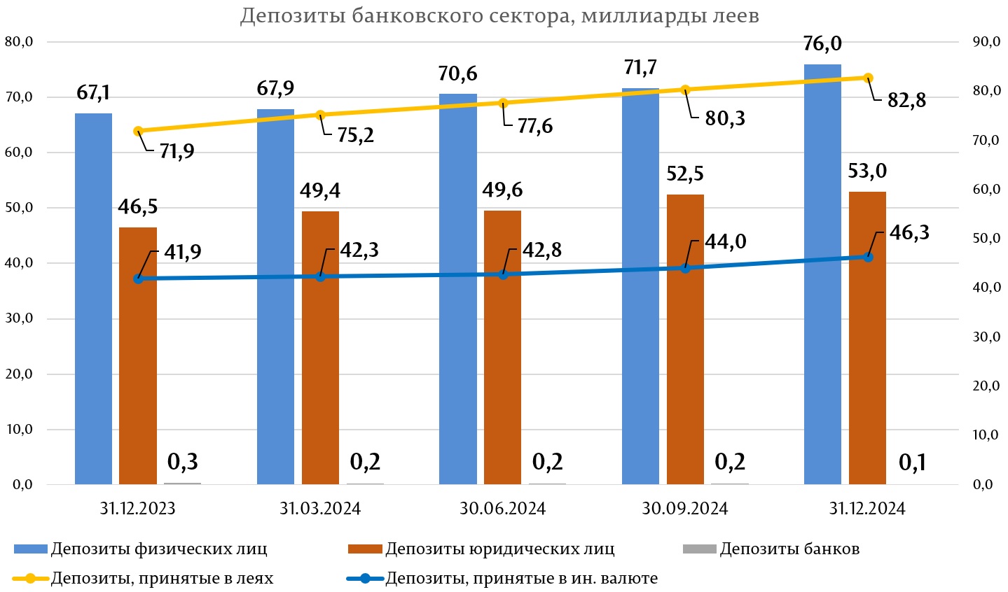 В общем объеме депозитов 64,1% составили депозиты в леях, остаток увеличился на 10 870,2 миллиона леев (15,1%) по сравнению с концом предыдущего года и на 31.12.2024 года составил 82 767,8 миллиона леев. Депозиты в иностранной валюте составили 35,9% от общего объема депозитов, их остаток увеличился за отчетный период на 4 374,8 миллиона леев (10,4%), составив 46 323,9 миллиона леев.