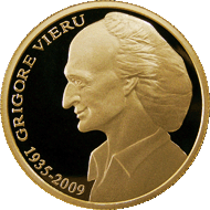 • в левой части по окружности монеты - заглавными буквами выгравированы надпись „GRIGORE VIERU” и даты „1935-2009”.