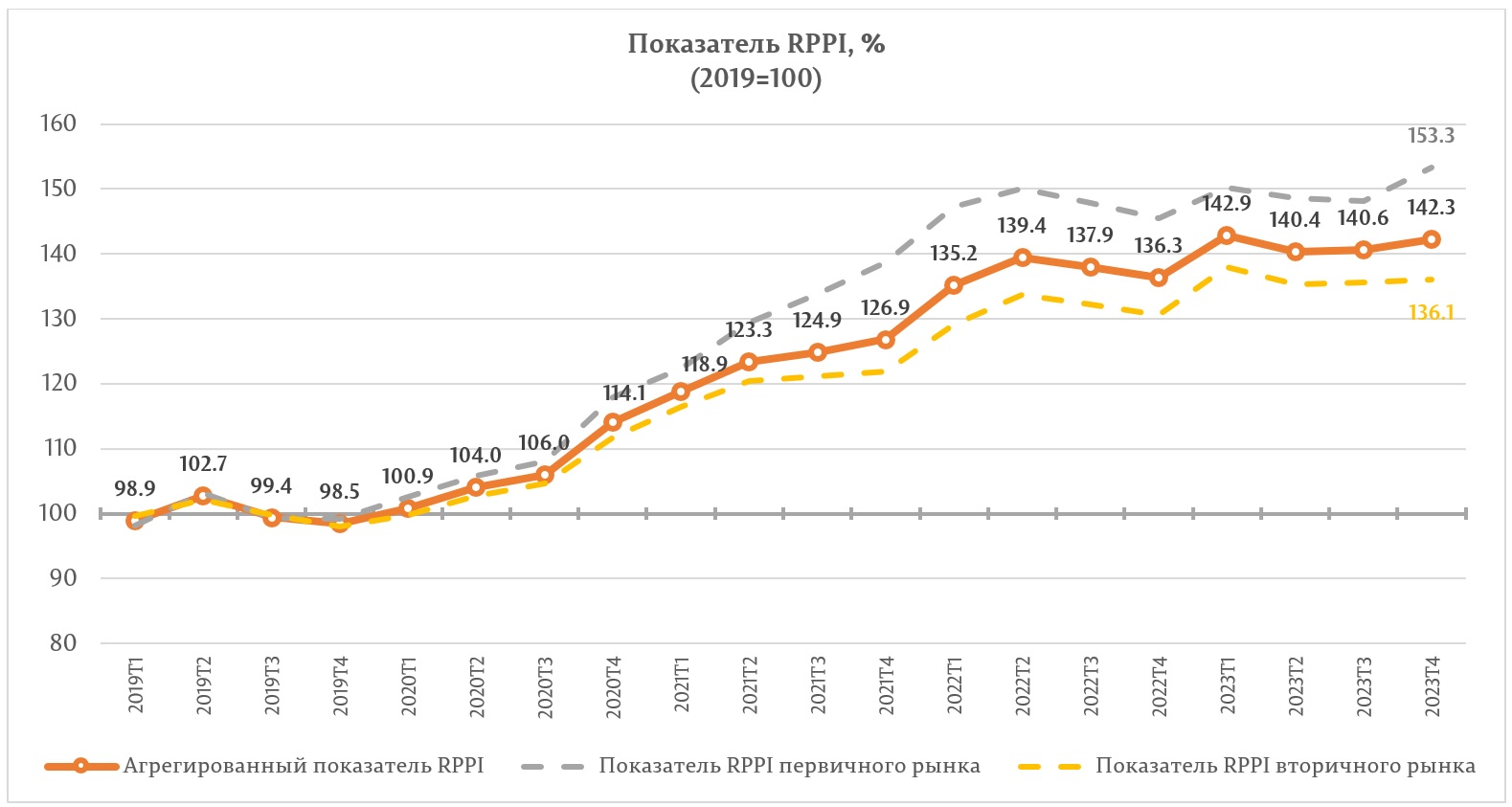 Показатель RPPI, соответствующий ценам на первичном рынке жилой недвижимости, составил 153,3 процента, что больше на 3,5 процента значения за 3-й квартал 2023 года, но больше на 5,3 процента значения за 4-й квартал 2022 года.