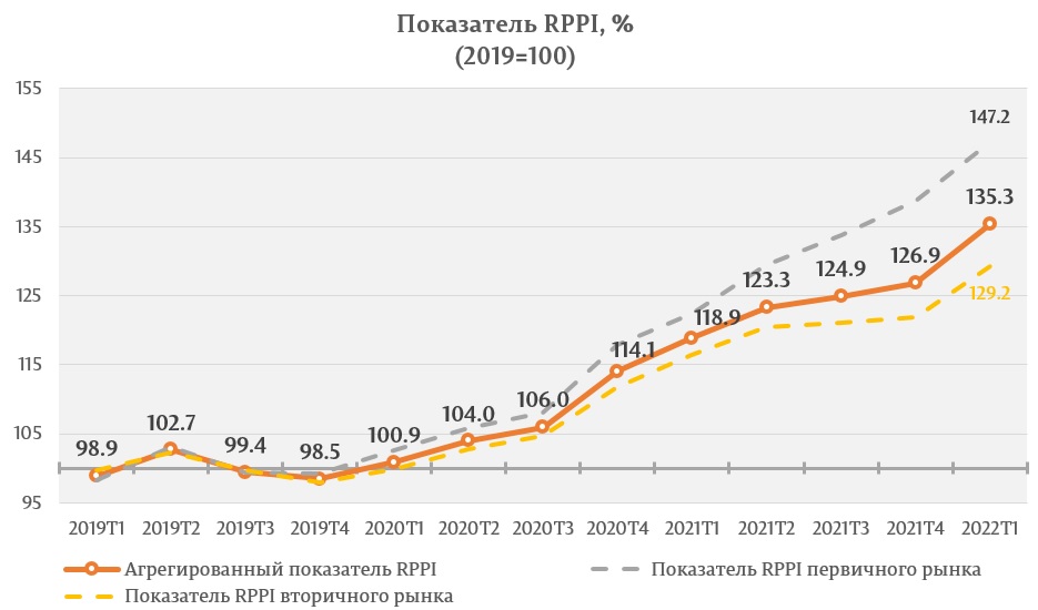 Показатель RPPI, соответствующий ценам на первичном рынке жилой недвижимости, составил 147,2 процента, будучи больше на 8,6 процента по сравнению с четвертым кварталом 2021 и на 20,4 процента по сравнению с первым кварталом 2021.