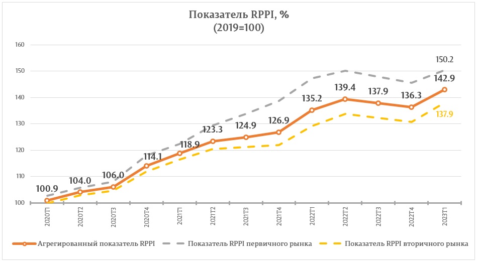 Показатель RPPI, соответствующий ценам на первичном рынке жилой недвижимости, составил 150,2 процента, что на 3,2 процента выше значения за 4-ый квартал 2022 года и на 2,0 процента выше значения за 1-ый квартал 2022 года.