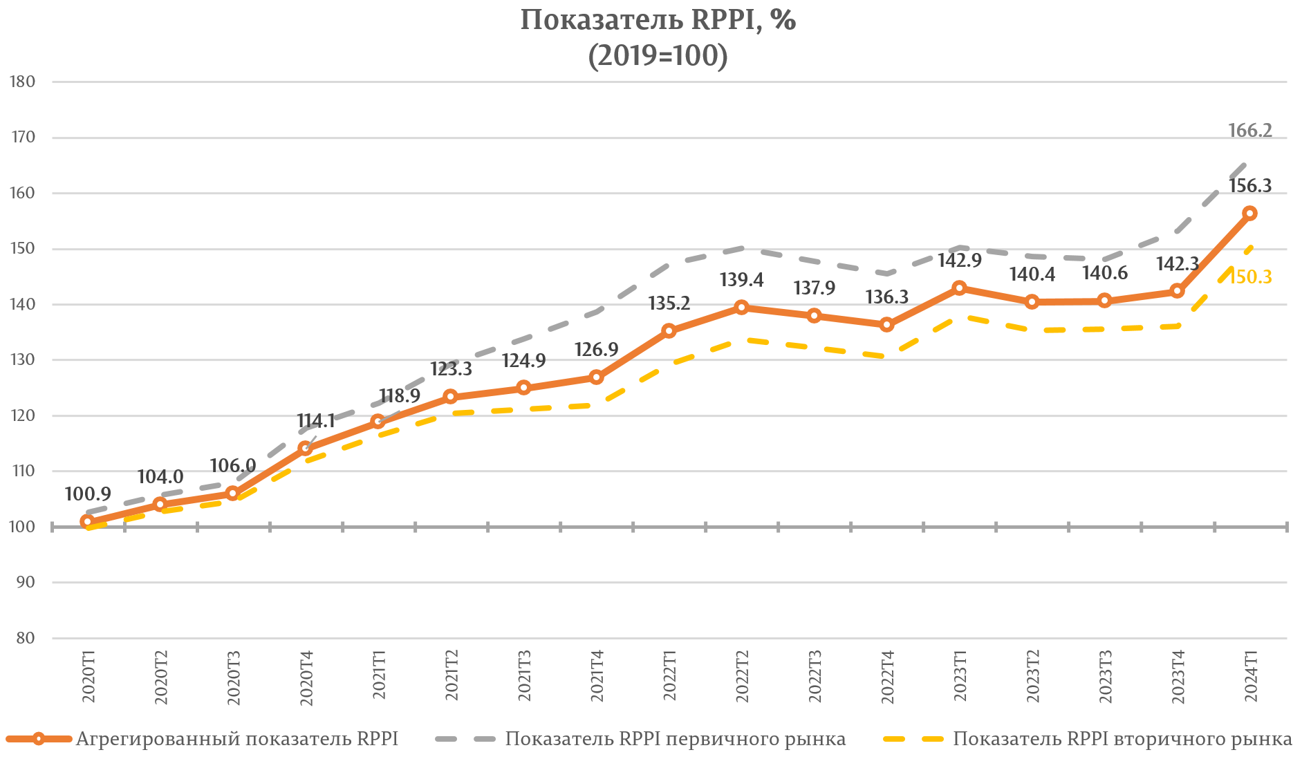 Показатель RPPI, соответствующий ценам на первичном рынке жилой недвижимости, составил 166,2 процента, что больше на 8,5 процента значения за 4-й квартал 2023 года, но больше на 10,7 процента значения за 1-й квартал 2023 года.