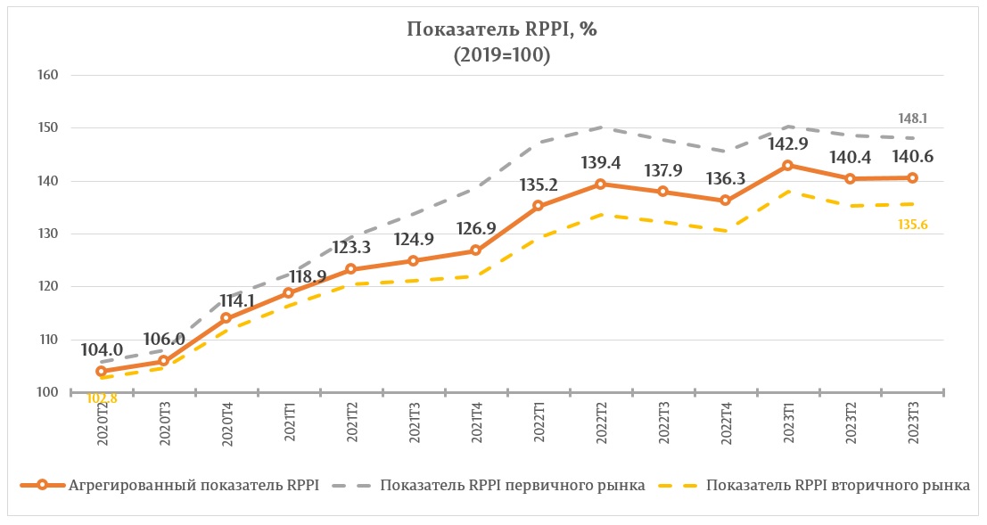 Показатель RPPI, соответствующий ценам на первичном рынке жилой недвижимости, составил 148,1 процента, что меньше на 0,5 процента значения за 2-й квартал 2023 года, но больше на 0,2 процента значения за 3-й квартал 2022 года.