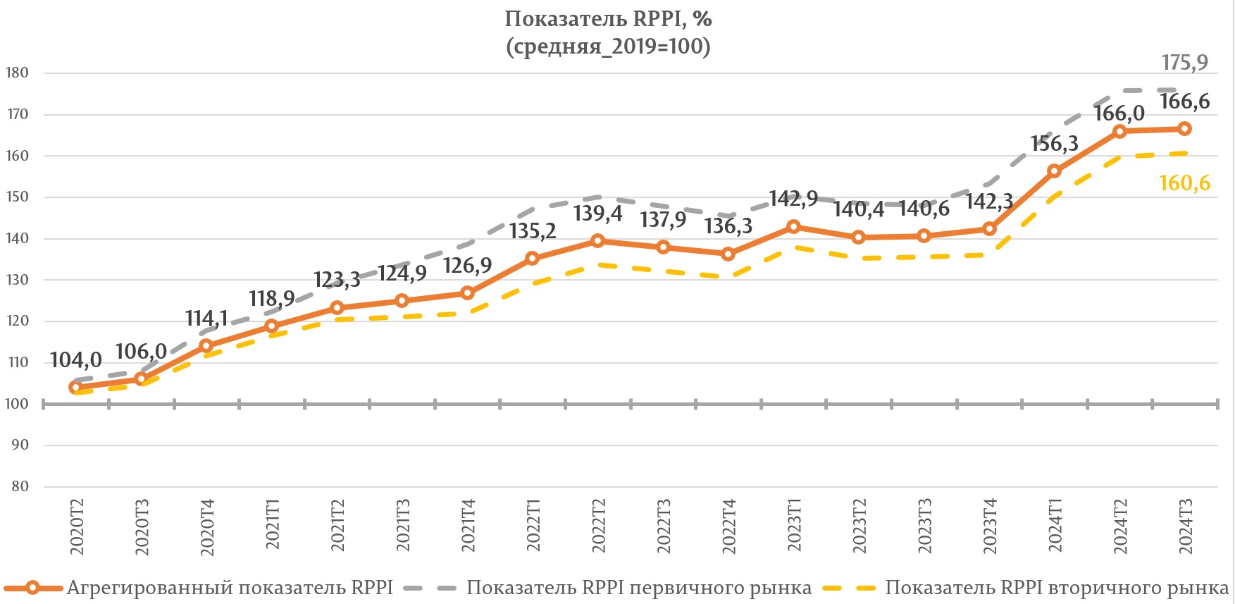 Показатель RPPI, соответствующий ценам на вторичном рынке жилой недвижимости, составил 160,6 процента, что на 0,5 процента больше значения за 2-й квартал 2024 года, и на 18,4 процента больше значения за 3-й квартал 2023 года.