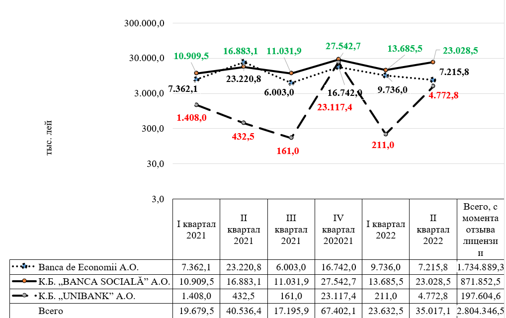 Ликвидаторы 3 банков в процессе ликвидации продолжают предпринимать меры по использованию активов в целях получения денежных средств. Таким образом, со дня отзыва лицензий (16.10.2015г.) и до 30.06.2022г. Banca de Economii A.О., КБ „BANCA SOCIALĂ” A.О. и Б.К. „UNIBANK” A.О. получили денежные средства на общую сумму 2 804 346,5 тыс. леев.