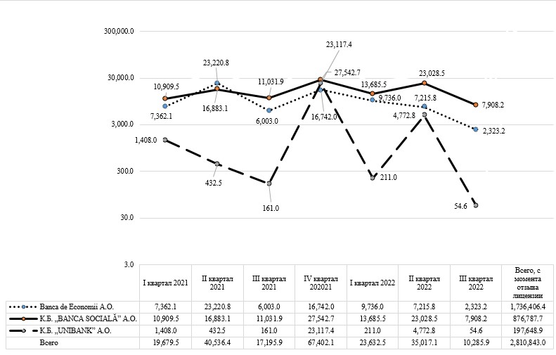 Диаграмма поступлений, зарегистрированных Banca de Economii А.О., КБ „BANCA SOCIALĂ” А.О. и К.Б. „UNIBANK” А.О. с 01.01.2021г. по 30.09.2022г.