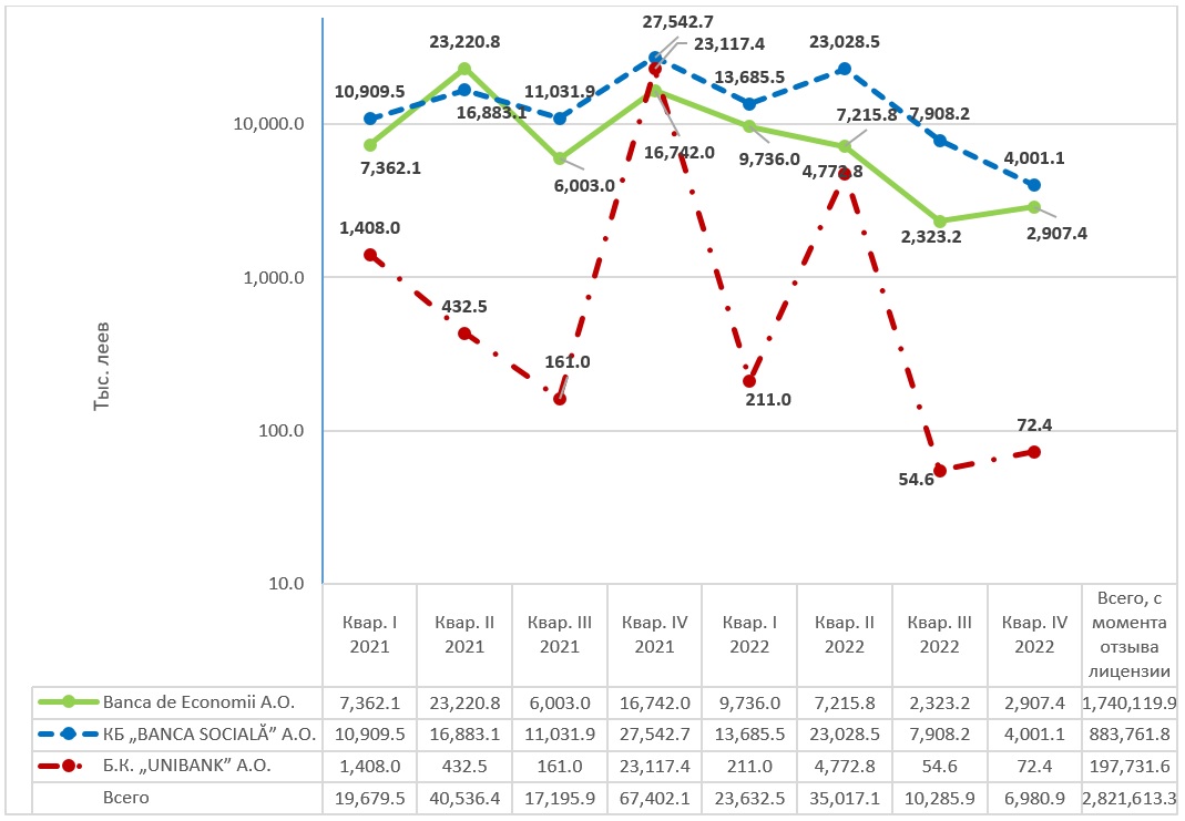 Ликвидаторы 3 банков в процессе ликвидации продолжают предпринимать меры по использованию активов в целях получения денежных средств. Таким образом, со дня отзыва лицензий (16.10.2015г.) и до 31.12.2022г. Banca de Economii A.О., КБ „BANCA SOCIALĂ” A.О. и К.Б. „UNIBANK” A.О. получили денежные средства на общую сумму 2 821 613,3 тыс. леев.