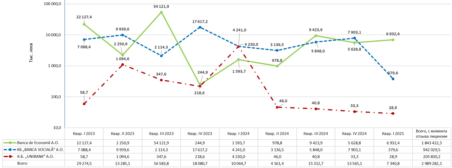 Ликвидаторы 3 банков в процессе ликвидации продолжают предпринимать меры по использованию активов в целях получения денежных средств. Таким образом, со дня отзыва лицензий (16.10.2015г.) и до 31.03.2025г. Banca de Economii A.О., КБ „BANCA SOCIALĂ” A.О. и К.Б. „UNIBANK” A.О. получили денежные средства на общую сумму 2 989 282,1 тыс. леев.