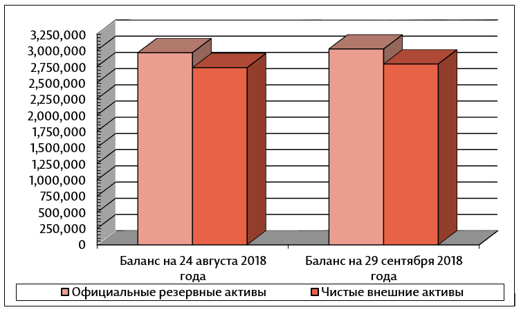 Официальные резервные активы на 29 сентября 2018 года исчислялись на уровне 3,021.18 млн. долларов США, на 57.96 млн. долларов США больше по сравнению с 24 августа 2018, когда они составляли 2,963.22 млн. долларов США.