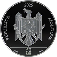 • Надписи «Ag 999», номинал «50 LEI» и «31,1 g» на свободном поле монеты.