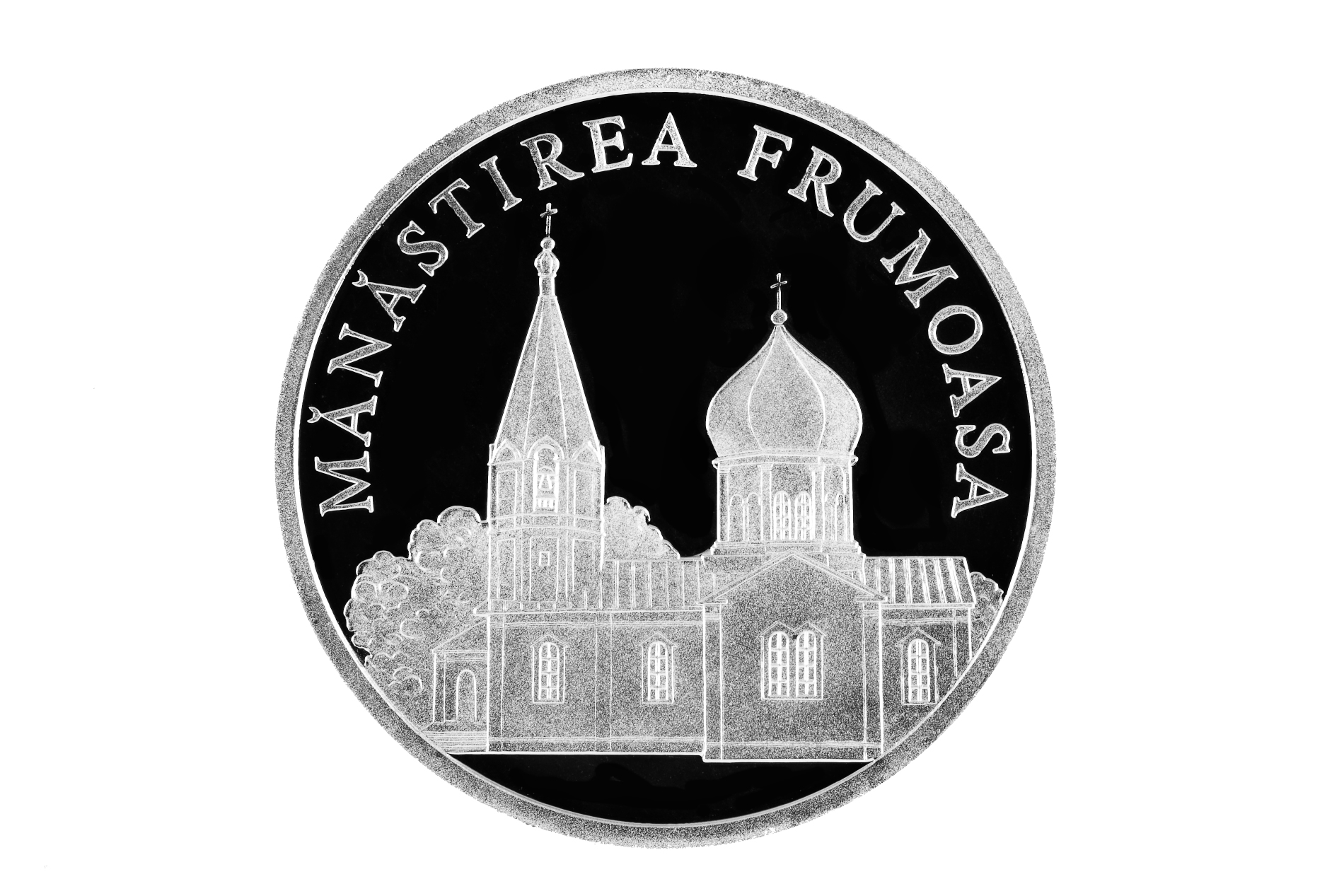 •  в верхней части, по окружности монеты – заглавными буквами выгравирована надпись "MĂNĂSTIREA FRUMOASA" .
