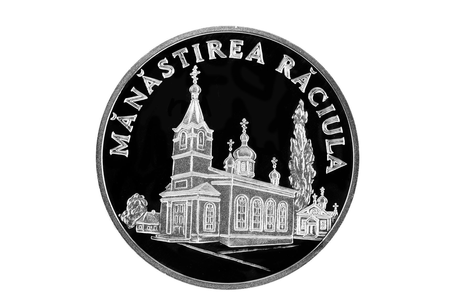 •  в верхней части, по окружности монеты – заглавными буквами выгравирована надпись "MĂNĂSTIREA RĂCIULA" .