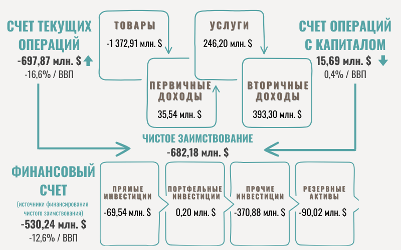 По предварительным данным, во II квартале 2024 года, дефицит текущего счета платежного баланса Республики Молдова достиг -697,87 млн. долл. США, +80,4% по сравнению со II кварталом 2023 года. По отношению к ВВП, текущий счет составил -16,6%. Счет операций с капиталом зафиксировал чистый приток на сумму 15,69 млн. долл. США, а финансовый счет – чистый приток финансовых средств, равный 530,24 млн. долл. США.