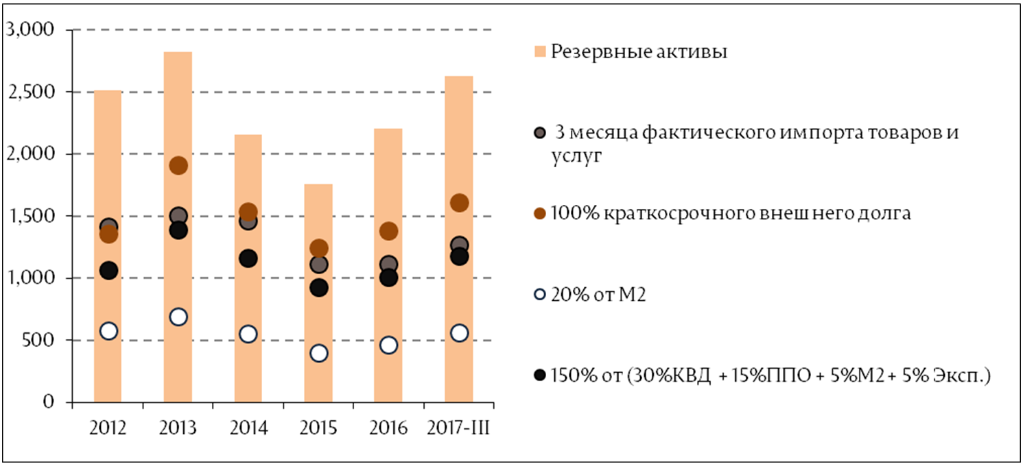 Примечание: критерии основаны на рекомендациях МВФ из "Assessing Reserve Adequacy - Specific Proposals", апрель 2015 г.