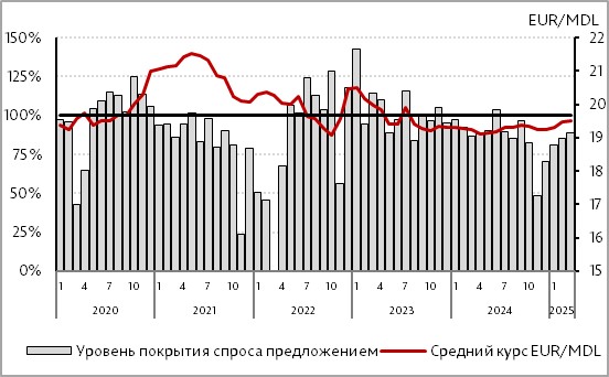 Средний курс молдавского лея к евро в марте вырос на 0,2%, до 19,5014 по сравнению с 19,4600 в феврале. Согласно значениям курса на конец месяца, он уменьшился на 0,4%4.