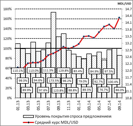 В сентябре 2014 степень покрытия чистого спроса экономических агентов на иностранную валюту чистым предложением иностранной валюты от физических лиц составила 86.0%, по сравнению с 100.4% в августе 2014. Чистое предложение иностранной валюты физических лиц снизилось на 9.6%, тогда как чистый спрос иностранной валюты со стороны юридических лиц вырос на 5.6%, по сравнению с предыдущим месяцем. В данных условиях, средний обменный курс национальной валюты по отношению к доллару США обесценился на 3.5% по сравнению с курсом, зарегистрированный в августе 2014.